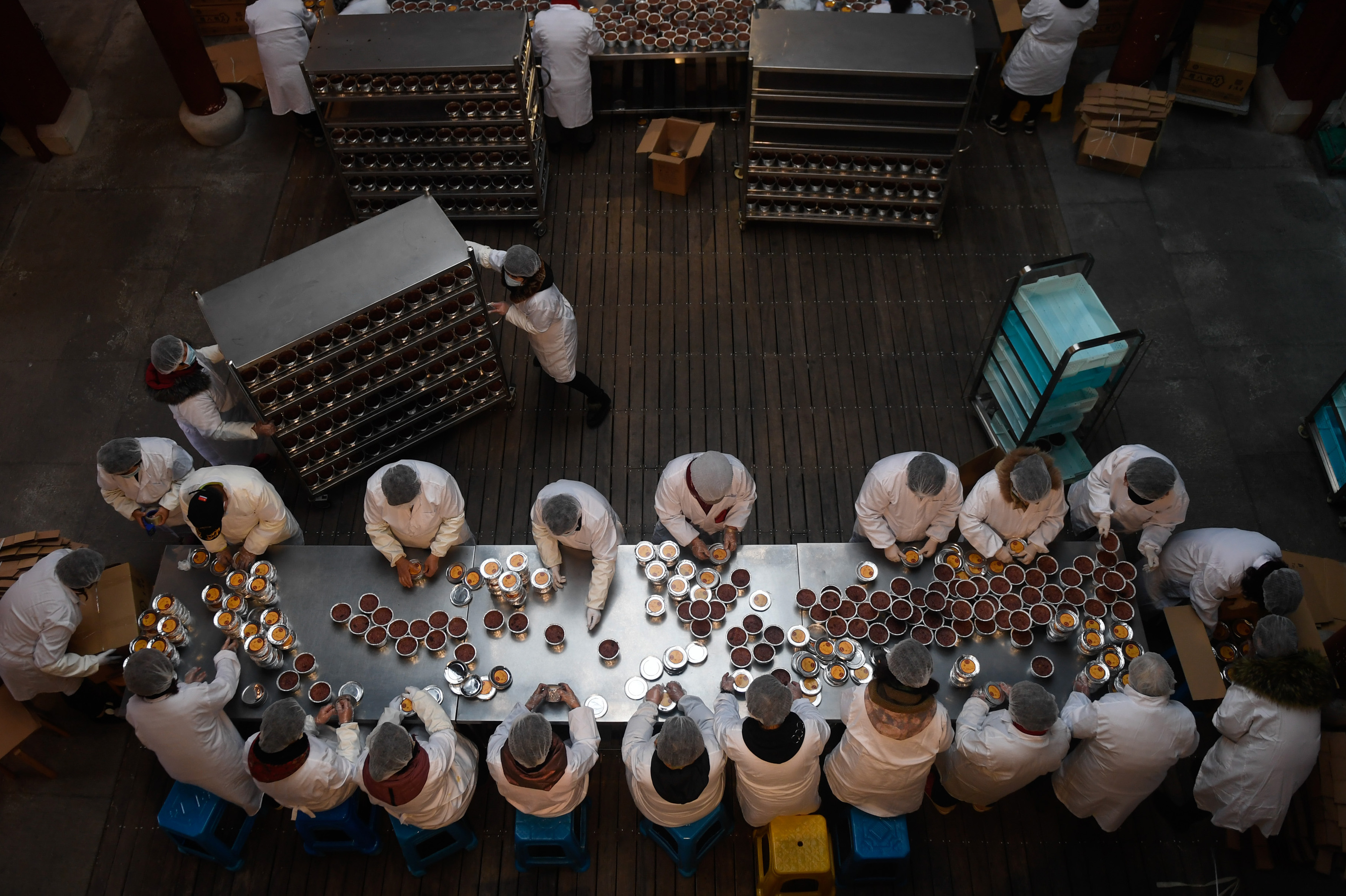 1月6日,杭州灵隐寺义工在分装腊八粥。当日是农历腊月初一,杭州灵隐寺开始熬制腊八粥。新华社/黄宗治