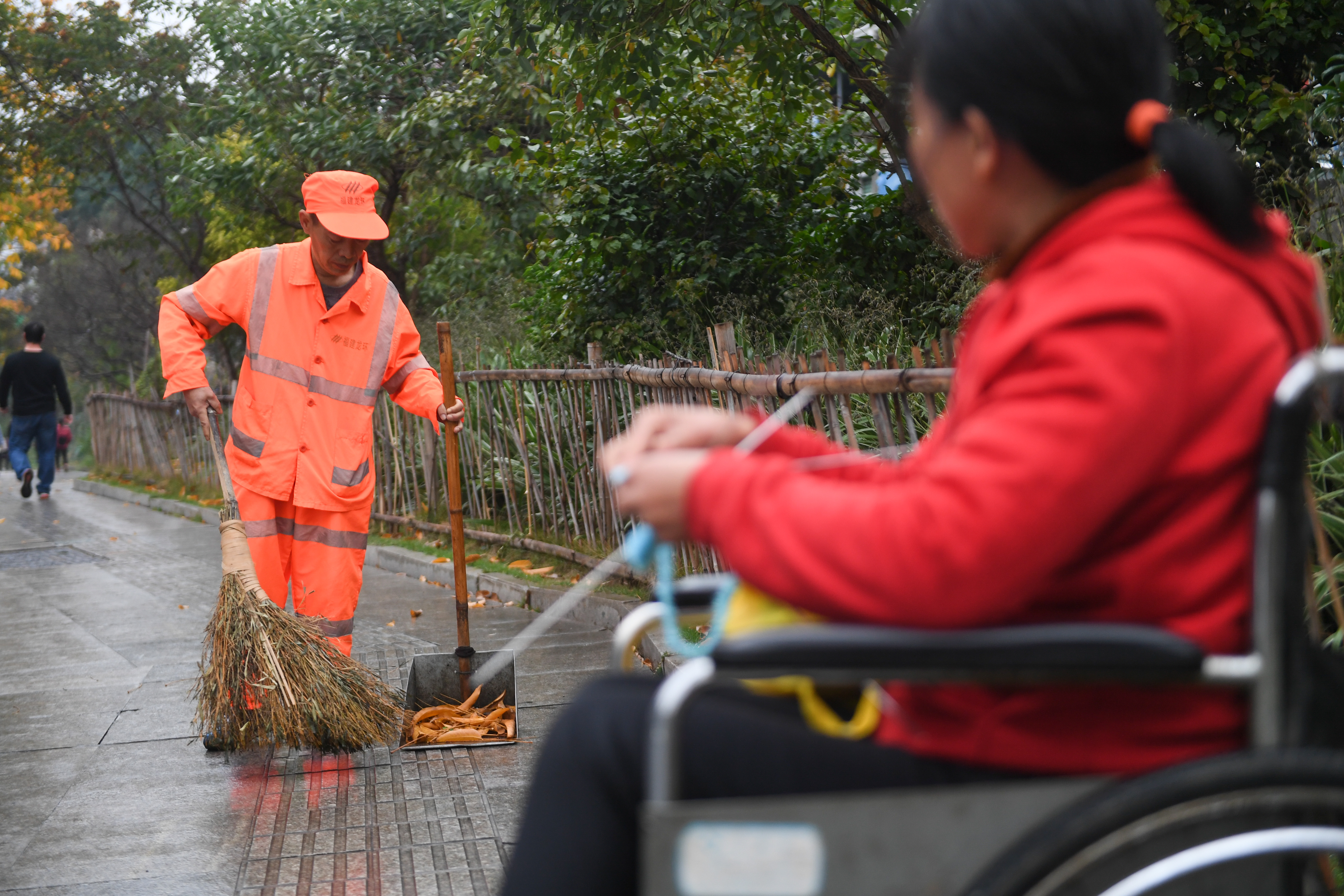 1月9日,董锦香坐着轮椅一边织毛衣,一边陪丈夫董基东清扫路面。在福建省龙岩市新罗区,有这样一份温暖长情的爱——环卫工董基东每天推着轮椅上的妻子董锦香扫马路,彼此陪伴、相互取暖,成为冬日街头一道暖人的风景线。新华社/宋为伟