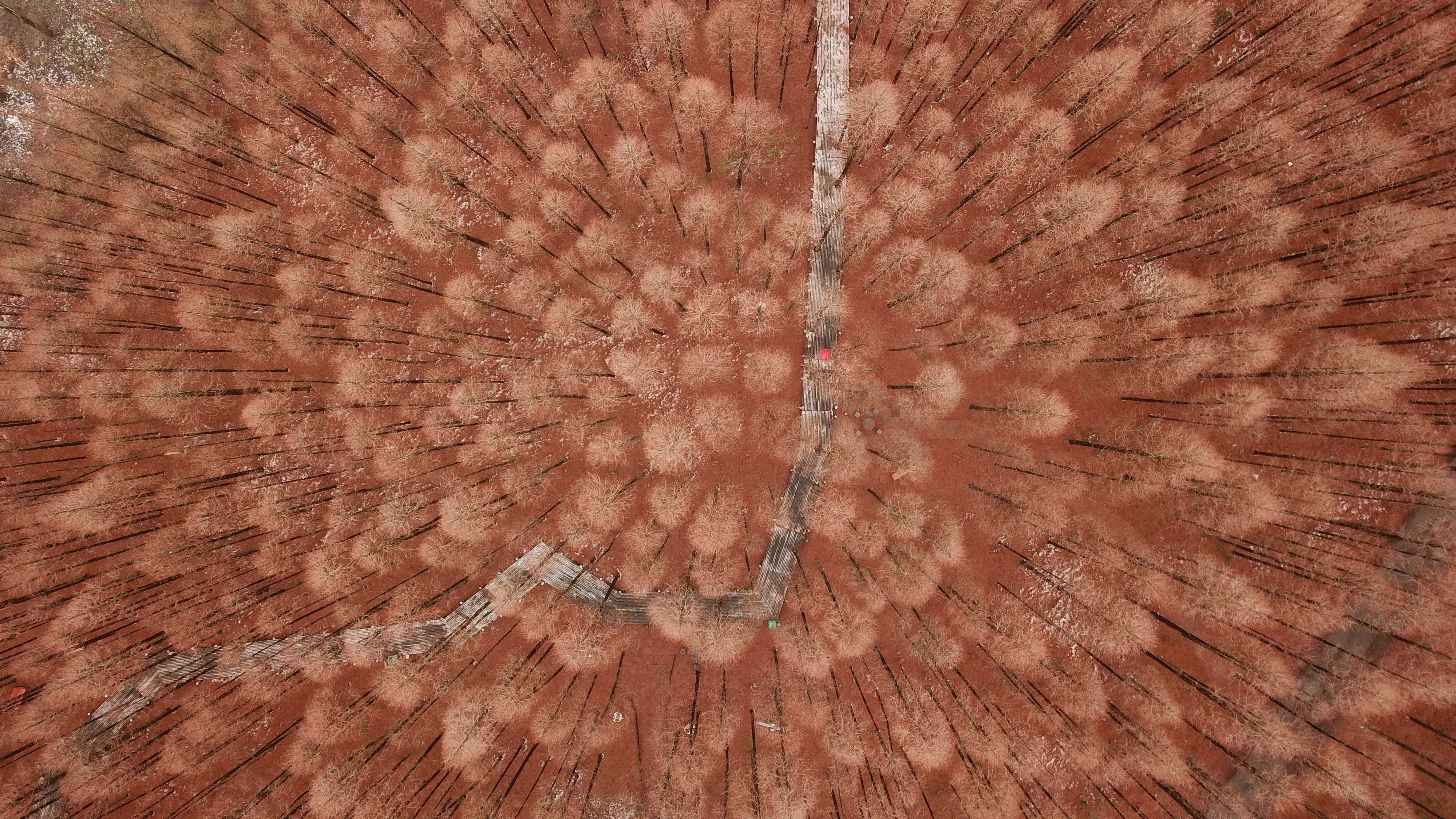 1月10日, 一场小雪后,江苏省淮安市洪泽区蒋坝镇一片杉树林在薄雪的覆盖下,呈现出别样的美(无人机拍摄)。新华社/万震