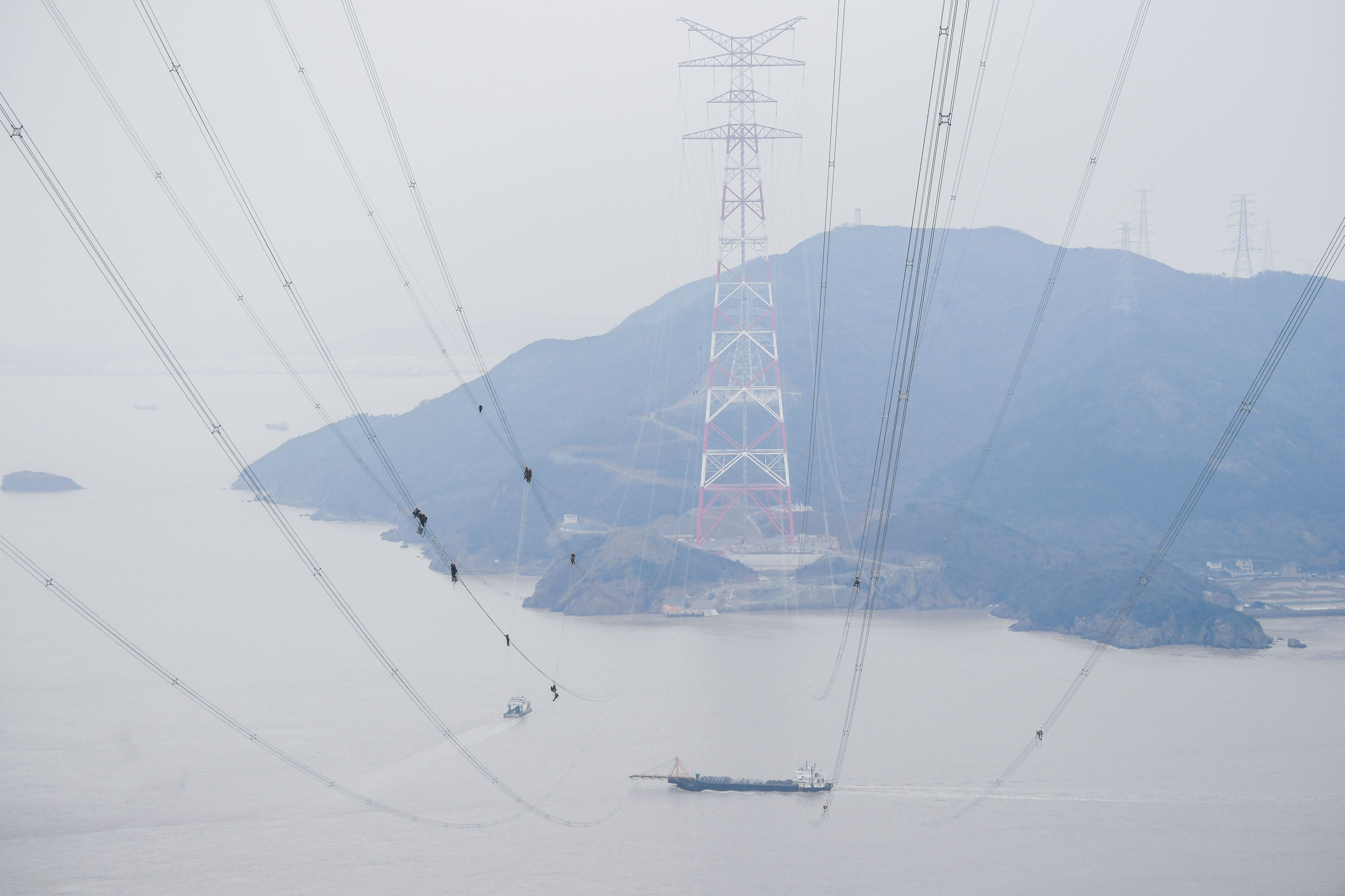 1月3日,施工人员沿着直径2.5厘米的导线进行高空行走,逐段排查导线隐患。近日,浙江省舟山500千伏联网输变电工程380米跨海输电铁塔——西堠门大跨高塔完成架线施工,进入最后的跨海线路验收和消缺工作。新华社/徐昱