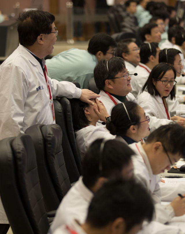1月3日,在北京航天飞行控制中心,科研人员庆祝降落成功。当日10时26分,嫦娥四号探测器自主着陆在月球背面南极-艾特肯盆地内的冯·卡门撞击坑内,实现人类探测器首次在月球背面软着陆。新华社/金立旺