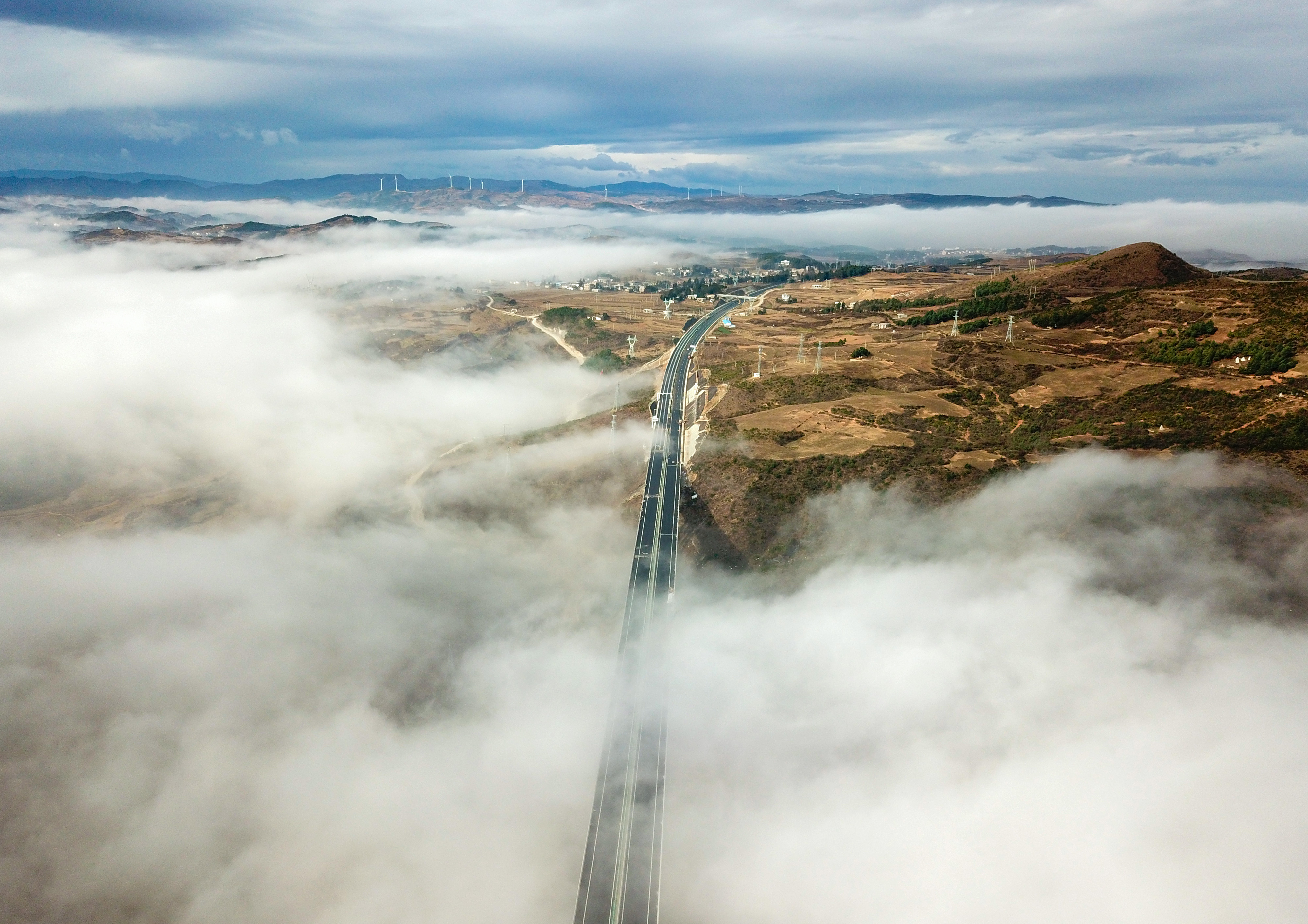 云雾中的贵州省六威高速公路观风海大桥(2018年12月19日无人机拍摄)。 1月3日,横跨我国云贵高原乌蒙山脉、贵州海拔最高高速公路——六(盘水)威(宁)高速公路正式通车,由此打通了一条由贵州西北角通往云南的快捷通道。新华社/何欢
