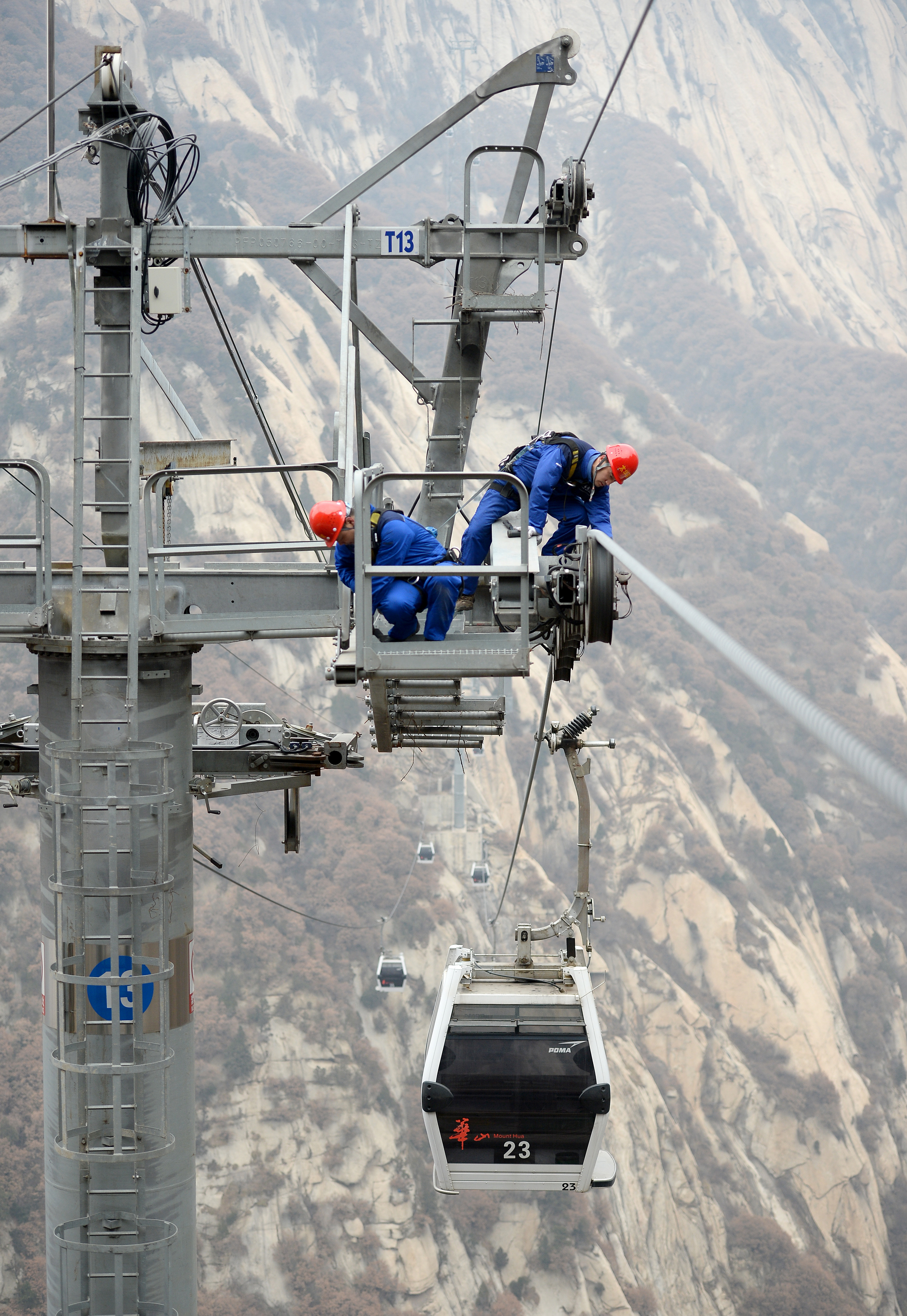 华山索道检修员张新建和梁斌(右)在华山太华索道支架上进行检修(2018年12月25日摄)。位于陕西省华阴市的西岳华山,被称为“奇险天下第一山”。从华山脚下乘太华索道至华山西峰,其惊险独特的体验和与众不同的风光,使该条索道成为登顶华山的“天空之路”。二十多名被称为华山“天路医生”的索道检修员日夜不停地守护着这条线路,张新建与梁斌,就是其中的成员。新华社/刘潇