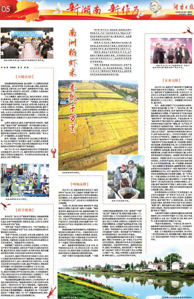 2018年9月,南县召开“南洲稻虾米”品牌打造暨进军国际市场书记调度会,会议形成了一个结论:“南洲稻虾米”品牌需要在种苗、标准化生产、对稻田及小龙虾违禁投放物的打击、品牌规范和使用、龙头企业加工溯源体系、做实研发提升、公共品牌创建等七大工程上着力,各职能部门要各尽其责,通力协作。