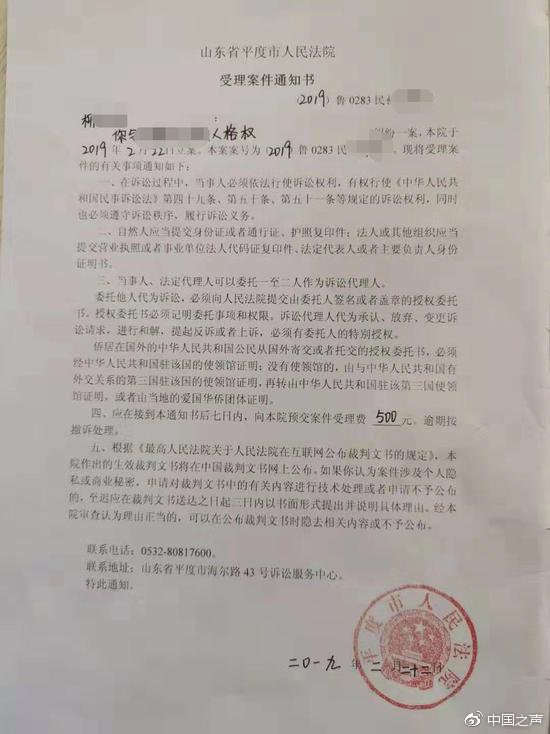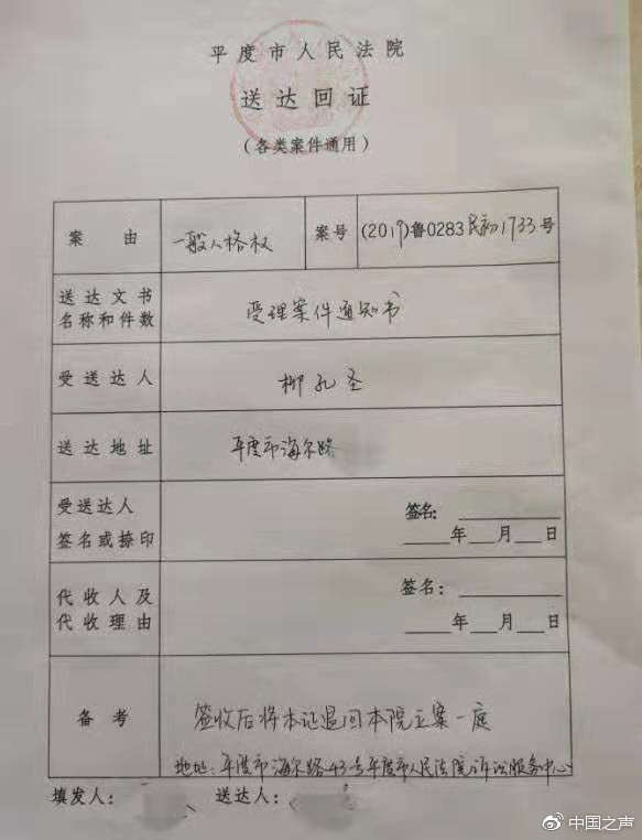 记者从平度法院了解到,法院已经向柳孔圣送达“案件受理通知书”,正式受理此案。