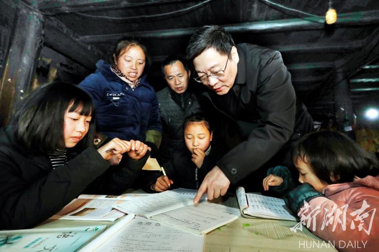 (2月11日,省委书记杜家毫在凤凰县火炉坪村隆培加家中走访慰问,查看学生们的寒假作业,并勉励他们好好学习,将来为社会作贡献。湖南日报记者 罗新国 摄)