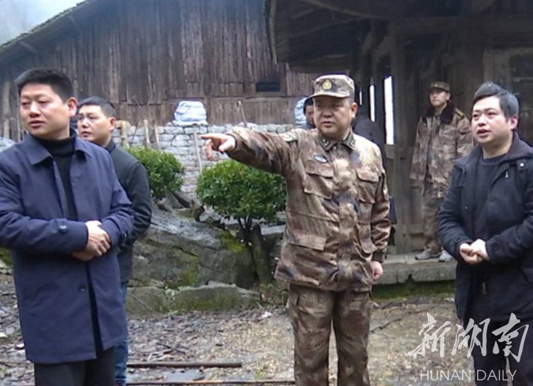 (2月12日,省委常委、省军区政治委员冯毅在桑植县瑞塔铺镇潮水河村调研脱贫攻坚。通讯员 杨明 摄)