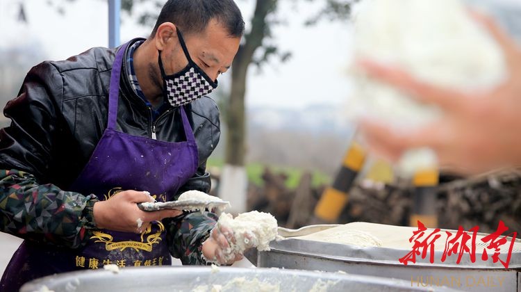 △1月28日,衡阳市蒸湘区雨母山镇新竹村,村民在制作手工鱼丸。 成俊峰 摄