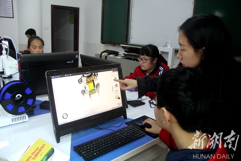 △郴州市六中”3D打印“兴趣班里,电脑教师正在指导学生进行作品设计