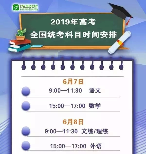 >教育部公布,2019年高考时间为6月7日、8日两天。