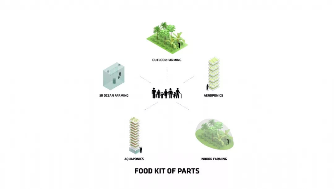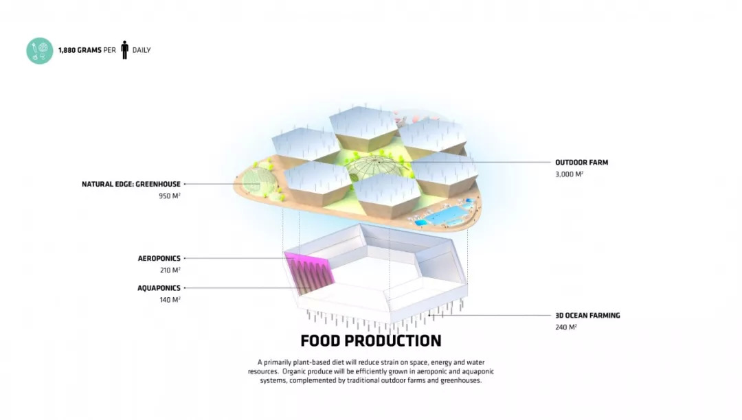 零废弃物设计中心创始人Clare Miflin说:“这个水上城市还需要尝试其他种植食物的方法,比如水培和太空种植,比传统农业少10倍的水,只需用雾喷洒植物根部,其中植物水培生长可以使用鱼类产生的废物”。