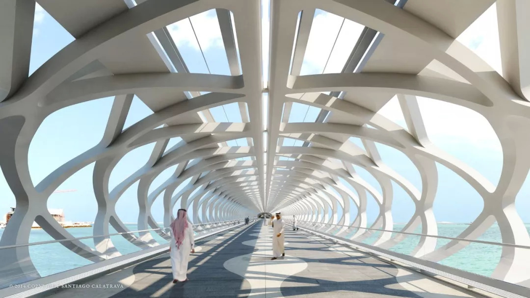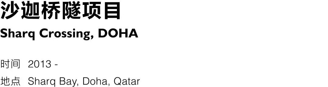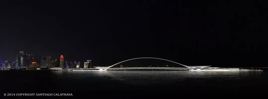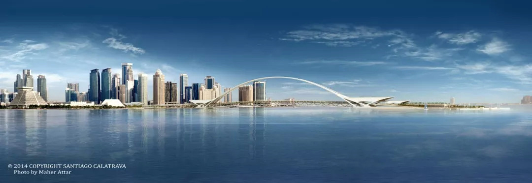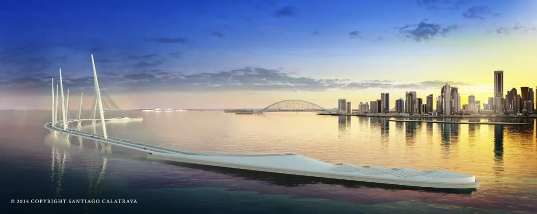 卡拉特拉瓦在多哈设计的沙迦桥隧项目总体规划(Sharq Crossing),是一个兼顾工程实效与标志性造型的案例。项目全长约12千米,包括3座造型抢眼的桥梁及与其相接的隧道,将机场区、西湾金融区、文化城相连。建成后,这一精彩的公共工程设计将成为多哈重要交通干道,以及独特的城市地标。