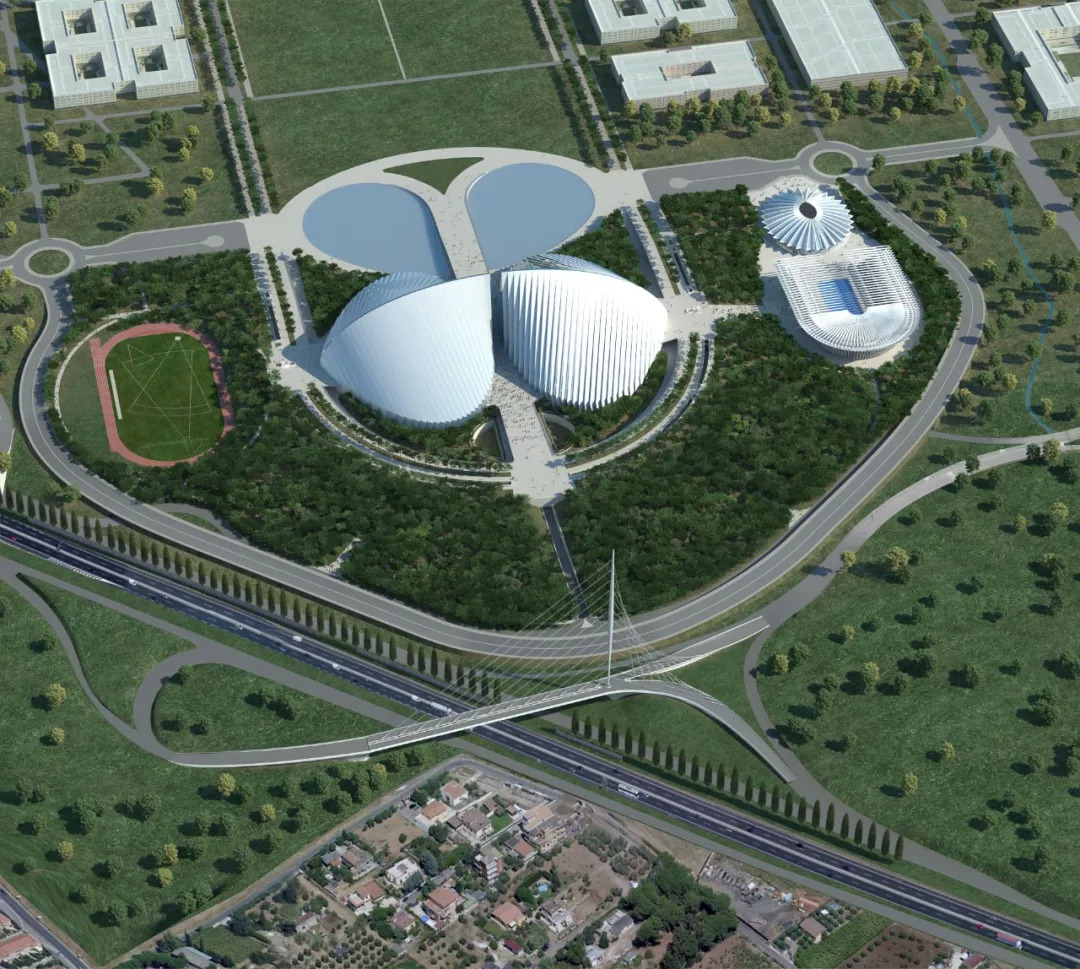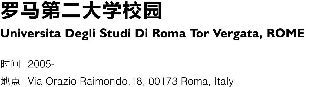 卡拉特拉瓦的罗马第二大学校园总体规划有意识地借鉴了古罗马大竞技场(Circus Maximus)的形制,设计有长长的通廊,并以柏树完整环绕。一个连接着大学和新建体育城的大型城市公园,将为此地会议、社会文化活动提供场所。此后将开发的其余建筑也将沿此大道排列,为学生提供住宿等空间。