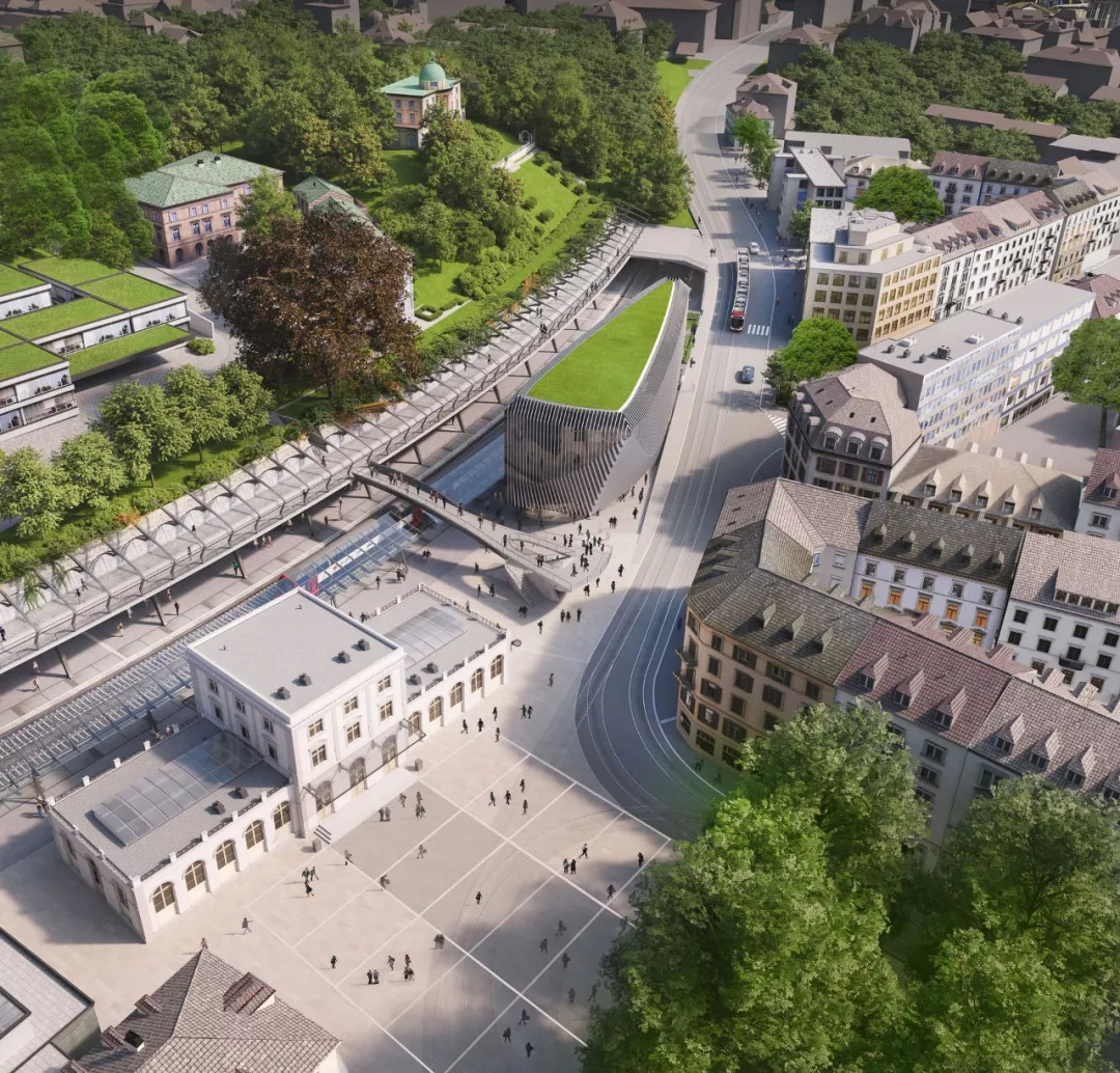 五层高的Haus Zum Falken办公楼,是卡拉特拉瓦与斯达德霍芬车站相关的另一个设计,建成后将与车站无缝相连。办公楼坐落于苏黎世核心区,与周边街景相融合,地下可供千辆自行车停放,并将很大地提升车站的步行可达性。
