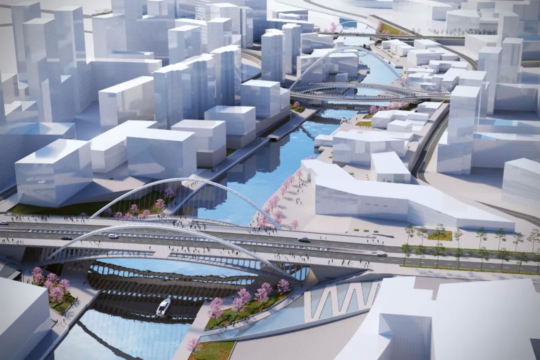受湖北省联投集团委托,卡拉特拉瓦将在武汉东部的花山新城设计建造三座地标性桥梁。桥梁横跨长江河道,建成后可同时供汽车、行人、自行车通行;拱桥雕塑般的外观在城市地景中十分突出,桥下空间的设计也经过了审慎考量。