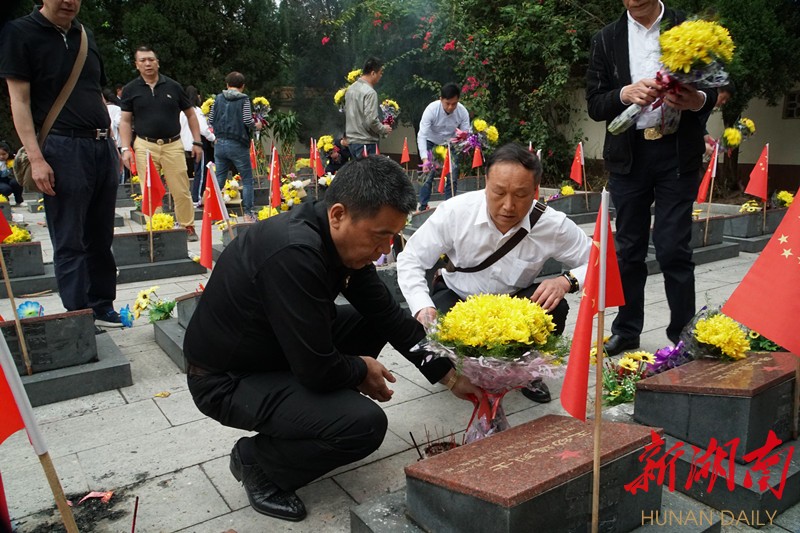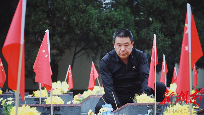 为了纪念安眠于此的3200余名烈士,朱豫刚每年都会精心准备。今年清明节,他提前十天在当地的花店预定3200余面国旗、3200余束鲜花,满满装了两辆公交车。为了让坟茔前的鲜花不至于过早枯萎,他特意嘱咐老板,在每束鲜花的包装底部装入保鲜营养液。