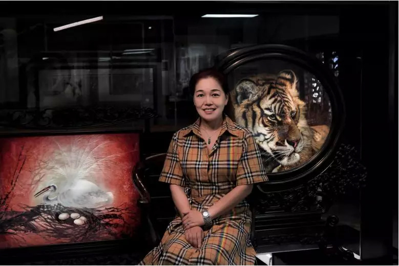 作为工艺美术大师,她对湘绣的最大贡献,就是从湘绣数百年的程式和传统章法里开疆辟土,找到了刺绣语言的新亮点。这在其代表作《山兽之君》《狮子与狐狸》中体现得淋漓尽致。《山兽之君》是湘绣的传统题材——一只威风凛凛、栩栩如生的老虎,眼睛上翘,仿佛就要发出一声长啸。这只老虎之所以如草泽雄风、活灵活现,是因为在刺绣针法上,已迥异于传统。在它的短毛长须间,李艳可谓使出了万般“魔法”:有传统的鬅毛针,有指导绣工创造的自由针、柔毛针、立体针,还加入了自己发明的汗毛针、卷毛针、绒毛针……披着浑身创新元素,这只霸气十足、呼之欲出的“吊睛白额虎”,为湘绣走向世界立下了一大奇功:在2013年香港保利拍卖行,以二百二十万元成交,创下湘绣产品拍卖的最高纪录。而《狮子与狐狸》则是李艳开发的大幅双全异绣作品,一面是卧狮伴犊,一面是狐狸护仔,母慈幼萌,一派睦亲温情。这件绣品,将动物鲜活的生命力,表达得极为细腻动人。她独特的视角,自由畅达的表现力,实在让人折服。