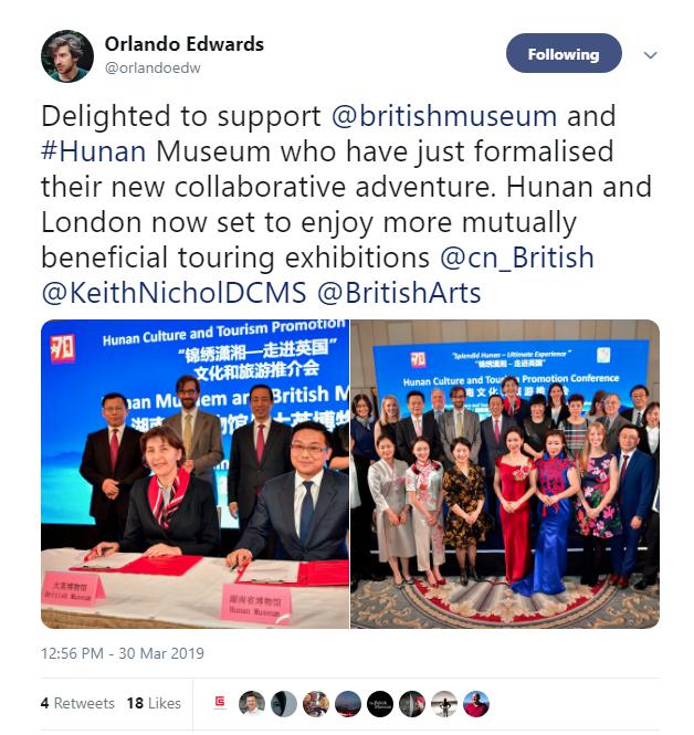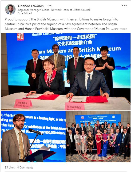 英国文化委员会美国和东南亚事务局局长奥兰多.爱德华兹(OrlandoEdwards) 推特(Twitter)和领英(LinkedIn)分别发文