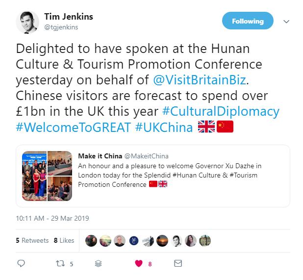 英国国家旅游局特派代表提姆.杰金森(Timothy Jenkins)推特(Twitter)发文: