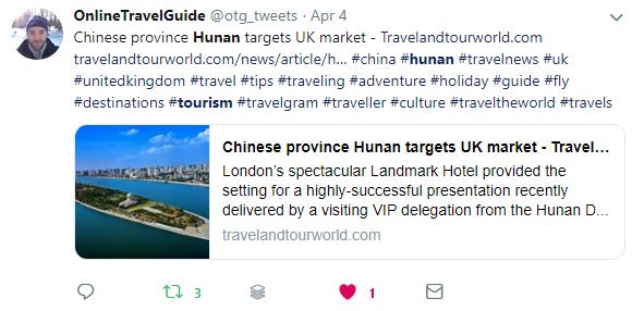 截止4月5日,英国媒体发表对"锦绣潇湘"走进英国-湖南文化和旅游推介会的各类英文报道21篇,其中,包括英国专业旅行杂志Travelandtourworld,英国旅行业内最有影响力的TravelBulletin等期刊的关注和报道,全球最早的旅行商杂志周刊TravelTradeGazette将在4月15日的期刊中单独报道此次推介会活动。此外,欧洲轻型电动车协会、知名旅行达人如美食专家和专业旅游网站也在网站和社交媒体上发文积极报道此次推介活动。