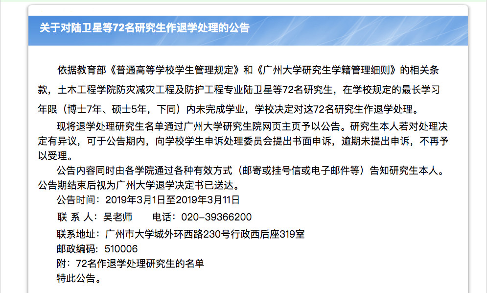 72名研究生在学校规定的最长学习年限(博士7年、硕士5年,下同)内未完成学业,学校决定对这72名研究生作退学处理。