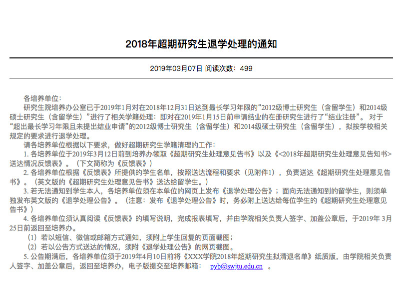 对于“超出最长学习年限且未提出结业申请”的2012级博士研究生(含留学生)和2014级硕士研究生(含留学生),拟按学校相关规定的要求进行退学处理。