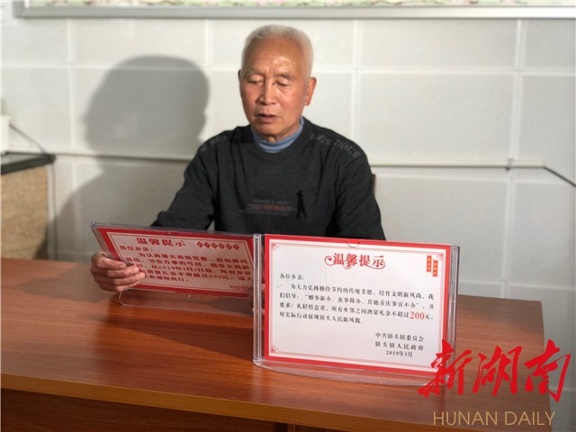 全面推行“人情礼金告示制”,全镇统一印制600余块“移风易俗温馨提示牌”,发放至11个村(社区),倡导乡邻之间礼金不超过200元。酒宴期间,村红白理事会将提示牌置于礼金台上,告诫宾客自觉遵守。