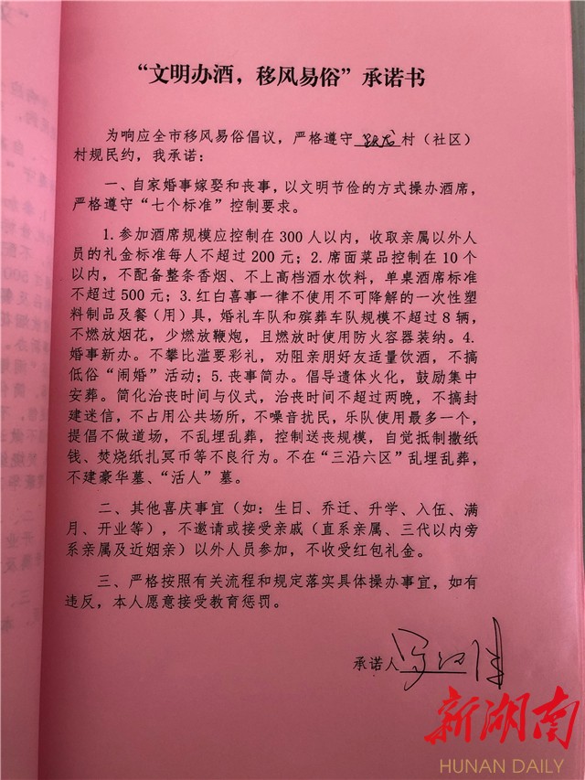 (村民签订的“文明办酒,移风易俗”承诺书)
