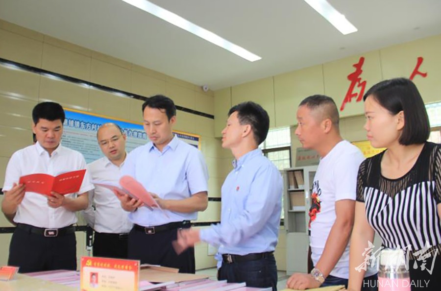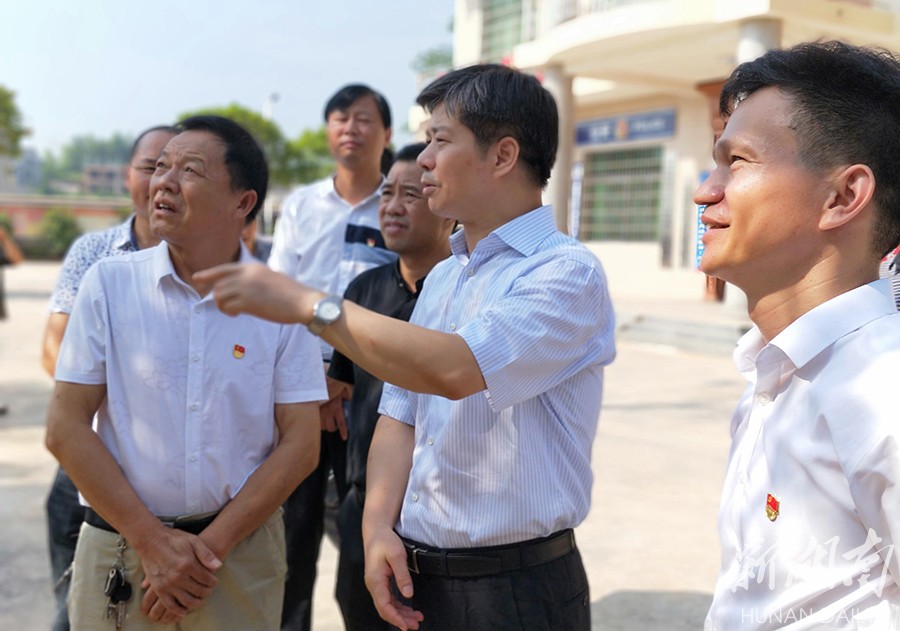 娄底市委常委、组织部长在尹华凯(左三)在双峰县三塘铺镇东方村调研脱贫攻坚工作。