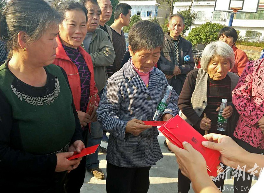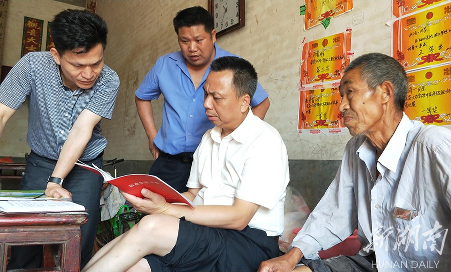 双峰县委副书记、县长彭石清(右二)在三塘铺镇大马冲村指导脱贫攻坚工作。