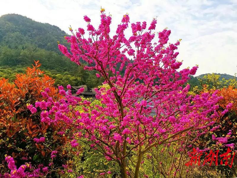 巨紫荆占尽地利,生长茂盛,五步一株,十步一丛,或鹤立于苍苍灌木之上,或并立于莽莽松林之中,或孤悬于崴嵬峭壁之隙。远远眺望,红花满树,状若一片火树霞林,真是紫荆犹知来人意,竞相怒放染层林。