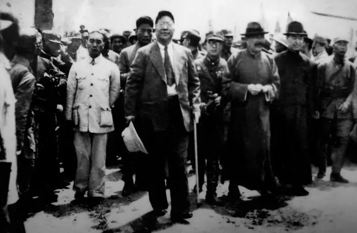 ▲1937年5月27日,杜斌丞(右三)同西安各界群众在机场欢送杨虎城将军(右五)离陕赴沪出国。
