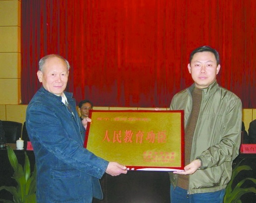 ( 2008年,汨罗市委、市人民政府授予素质教育先行者黄泽南同志(左)“人民教育功臣”荣誉称号。资料照片 通讯员 摄)