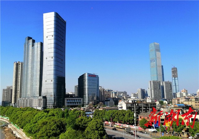 从杜甫江阁放眼望去,平整笔直的湘江大道车流不息,“华远华中心”高入云天,蓝色的玻璃幕墙辉映在碧空下。西斜的太阳照得湘江水面波光潋滟,一艘游轮正穿过橘子洲大桥徐徐而来,远处江岸绿影蜿蜒重嶂,流连的人们衣襟缤纷,一派和谐平静的美好景致。北边长廊边上,传来游人“两只黄鹂鸣翠柳,一行白鹭上青天”的颂诵,伴有人群歌舞的旋律和喝彩声,若有若无。
