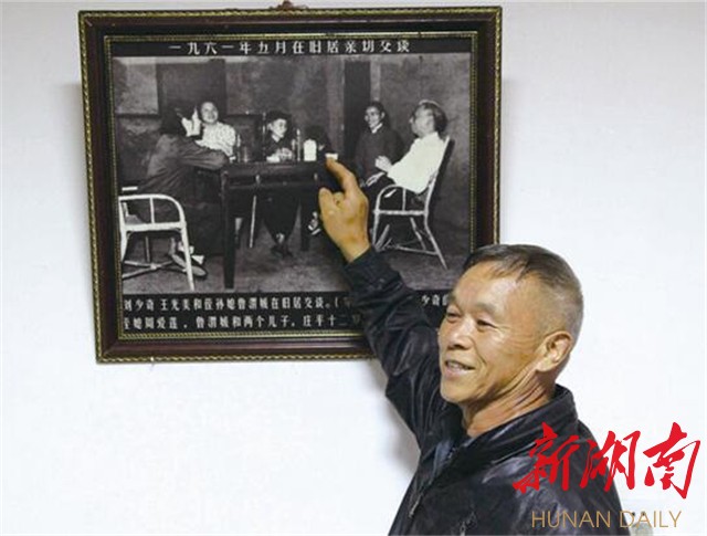 “这个正在埋头吃东西的人就是我,我旁边右二坐的就是刘少奇主席。”花明楼镇炭子冲村民刘庄宪是刘少奇主席的侄曾孙,忆起1961年少奇主席回故里的情景,神釆飞扬。他指着墙上一张黑白照片告诉记者,当时,他才7岁,但这次见面,让如今已65岁的刘庄宪终生难忘。