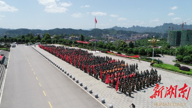 5月11日下午,湘西土家族苗族自治州永顺县行政中心前,来自该县民兵应急连、各乡镇应急排及各特殊、专业民兵分队近千名基干民兵身着丛林迷彩服,昂首挺胸、整齐列队于艳阳下,接受集中点验和交叉检查考评。