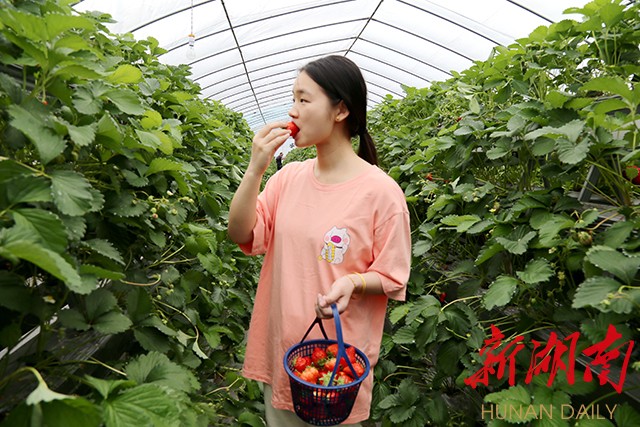 “真是太好吃了,我一定多买点回去,给亲戚朋友吃!”蔓绿果红间,一群游客正在开心地边摘边吃,欢声笑语伴随着草莓鲜香向四周荡漾开来。