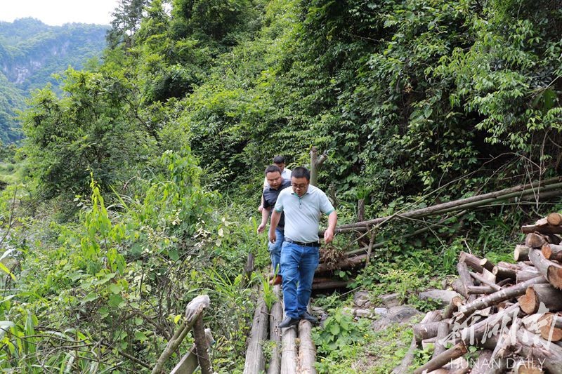吃罢午饭,又出发开一小时车沿酉水而下,到达小溪镇老村村部,车子开不进去,朱玉文就和同行的湖南日报摄影记者童迪开始徒步爬羊坡界。