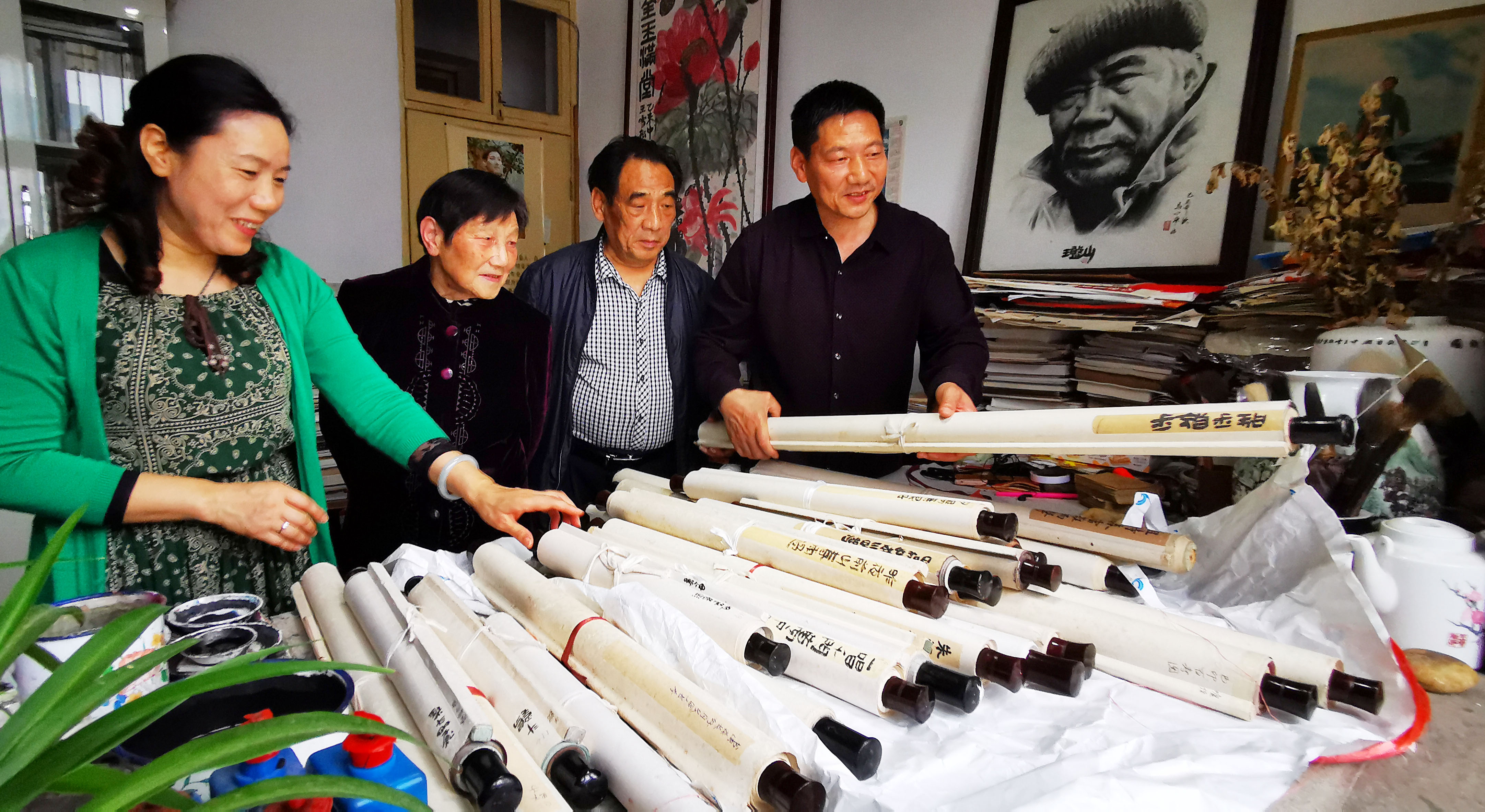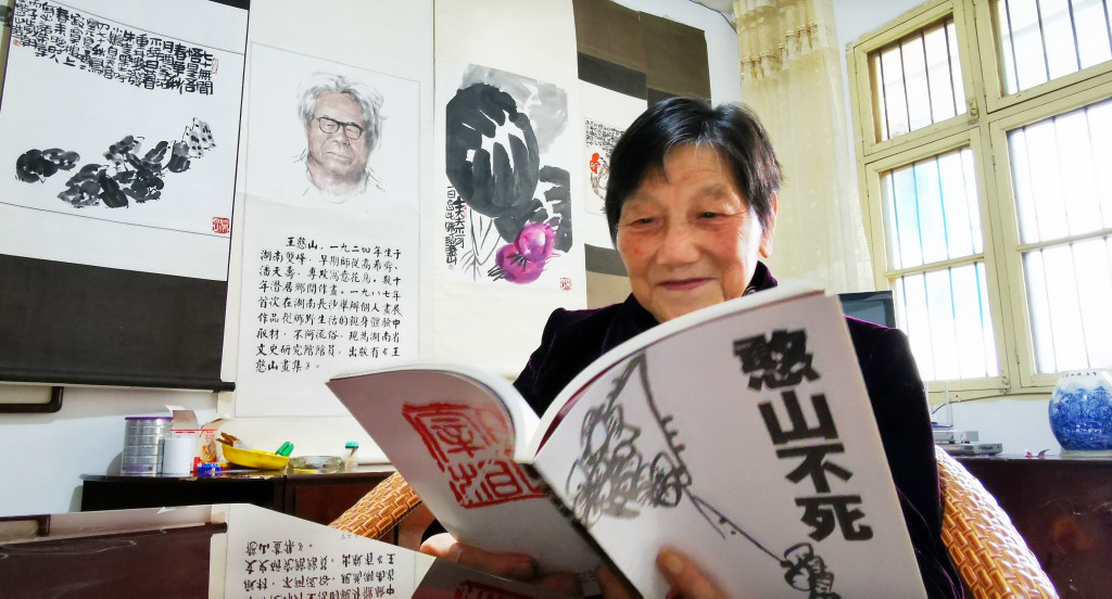 5月15日,我们新湖南《湘江·艺术收藏》栏目记者,来到双峰县城王憨山二儿子王雪松的家。一进门,王老87岁的妻子谢继韫笑容可掬地对着我们说:“我们中午等着你们一起吃饭的呢,哪里知道你们讲客气从外面吃了进来。”王老的大儿子王雪樵,小儿子王雪松,女儿王彥青,都齐聚到王雪松家里,一起商量着王老这次湖湘论坛“王憨山艺术作品品鉴展”的事,画桌上,沙发上都堆着王老的画作和有关他的书籍。王老的家人围在一起,气氛有点像是过年。