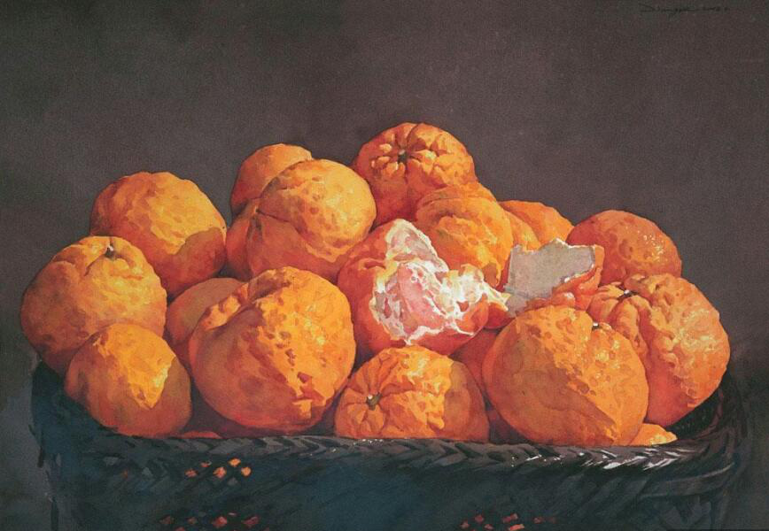 蒋烨的水彩画,不论是画水果静物,喧闹集市,或者悠远风景,都表现了不同面貌的阳光。时而灿烂,时而斑驳,时而轻盈,时而温润,时而悠长,时而宁和。你看他画的水果静物画,阳光清灵透亮,色彩饱满温润, 视觉效果极佳。