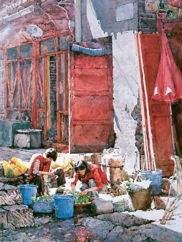 蒋烨画古巷,阳光明亮,映衬得古巷一片新意。那些陈旧红木门和青石板,似洒落的斑驳光影般,静谧亘久。