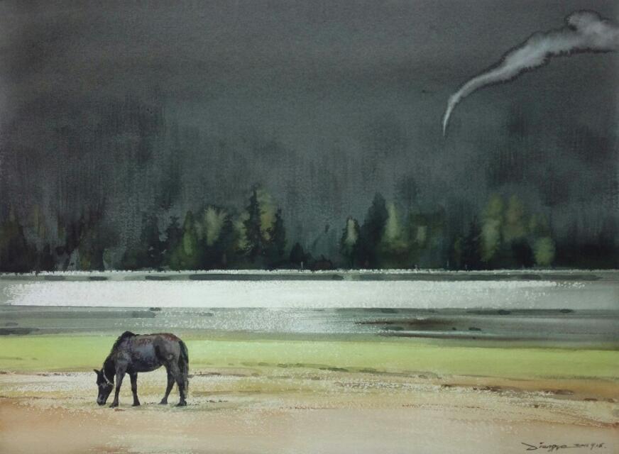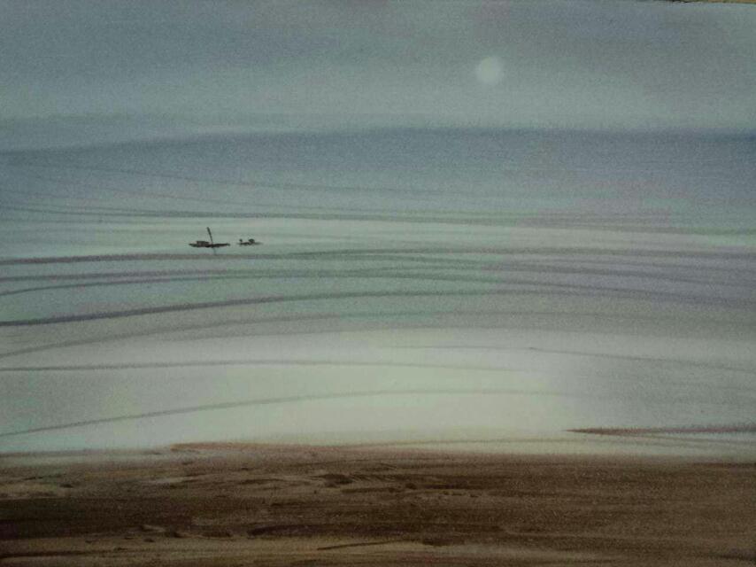 首先来看看这幅海上明月图。这幅很有意思,它是一幅水彩画,但它又像一幅中国古典水墨画。画面宁静淡雅的色调,天边一轮淡月。画者放弃了对于海波浪的细致的刻画,而采用仿似中国古典水墨画中,吴带当风般优美流畅的波浪线,层层堆栈出起伏写意的海面,这就是艺术的提练与升华。而那两点小得不能再小的的孤舟,更无限的延伸出海的深沉宽广与静谧。仿若张九龄吟唱: 海上生明月,天涯共此时,令观者衍生出无限想象。又似张若虚笔下的美景: 春江潮水连海平,海上明月共潮生。滟滟随波千万里,何处春江不月明...画面溢满诗情画意。