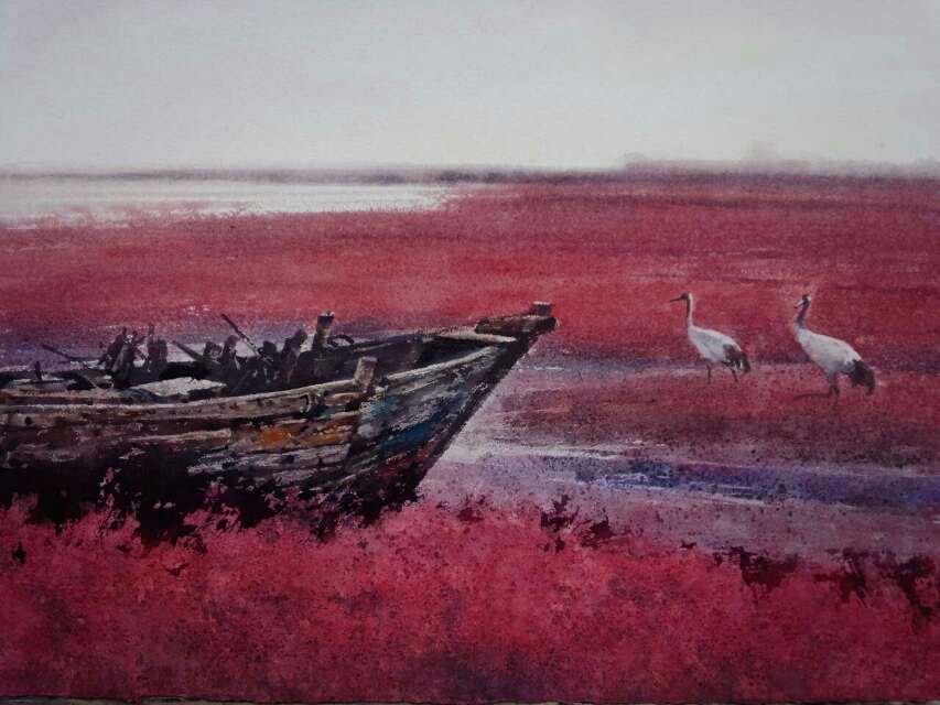 而这幅鹤与船的图画,和前一幅相反,显现出无人的静谧世界。那斑驳残破的渔船,显是被人废弃已久。渔船旁两只优雅的白鹤,静静凝望远方的水景。河岸边是大片生机勃勃,鲜红润泽的野生水草,写意得象是水面上浮动的云梦。而那两只优雅的鹤,更象是为画面注入的灵气,使得画面散发着浓浓的人文气息。