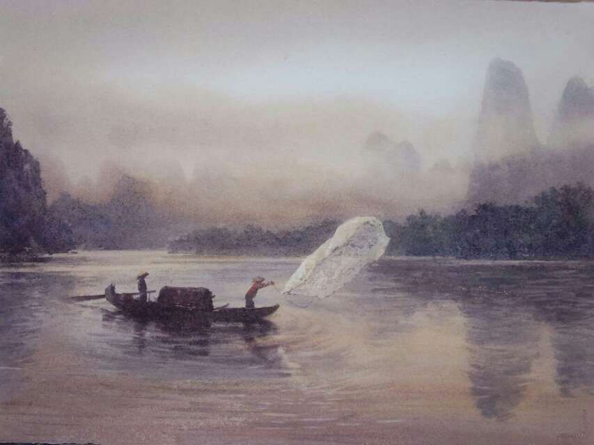 最后再看这幅捕鱼人家,终于出现人的踪迹,画面温暖喜悦又宁静祥和。朦胧的晨曦中,渔家人辛勤撒网捕渔,四周山川水景美如仙境。生动的描绘人与自然间,相依相存的亲密关系。优美和谐得像首诗,一首咏叹悠长岁月,生生不息的诗歌。