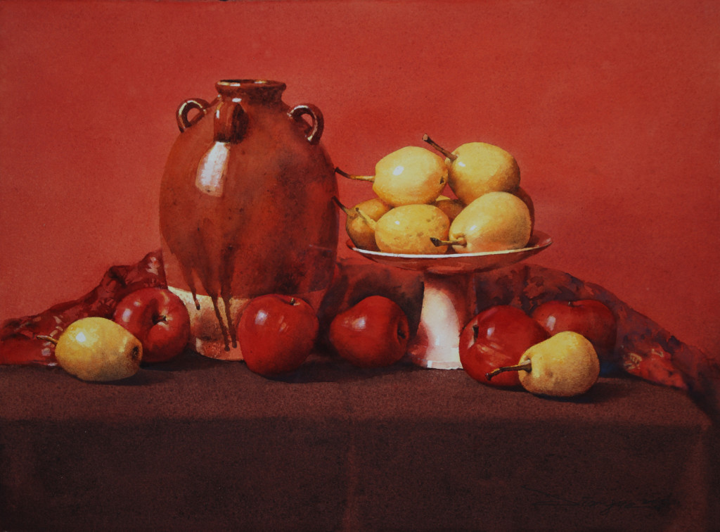 在蒋烨的作品中,洋溢着对色彩与光影的赞美,注重色彩情感乐章与节拍的表达,善于在画面趣味中心使用小面积纯色,在周围的灰色、亮色与暗色的对比下,造成极强的视觉冲击力,也使主题更加鲜明、突出。另外,蒋烨在学习传统的水彩画语言的基础上,注意吸收中国传统绘画的精髓,力求将水彩画语言转化为虚实相依,有无相生,道法自然,空灵自由的表现境界,这在他的静物作品中其主体物用色鲜明、用笔精到,用水自由、随意、洒脱,其色彩简朴产生的美学效应蕴涵着无穷回味的意趣。
