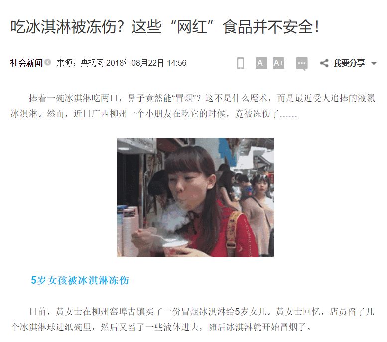 央视网曾报道冒烟冰淇淋冻伤事件。/ 央视网截图