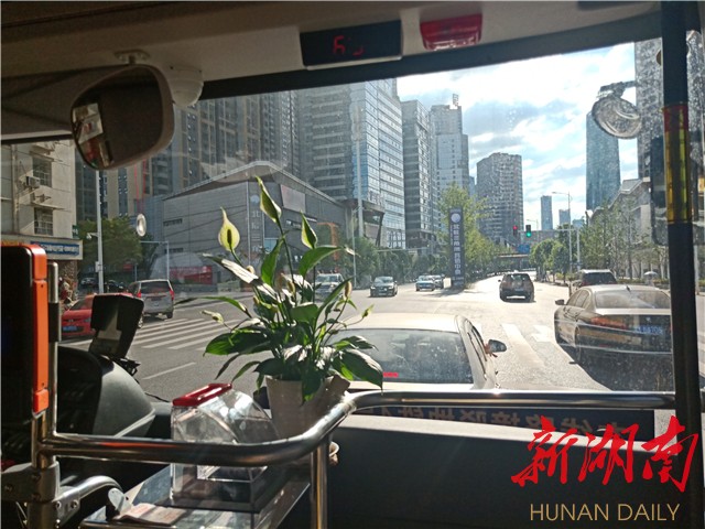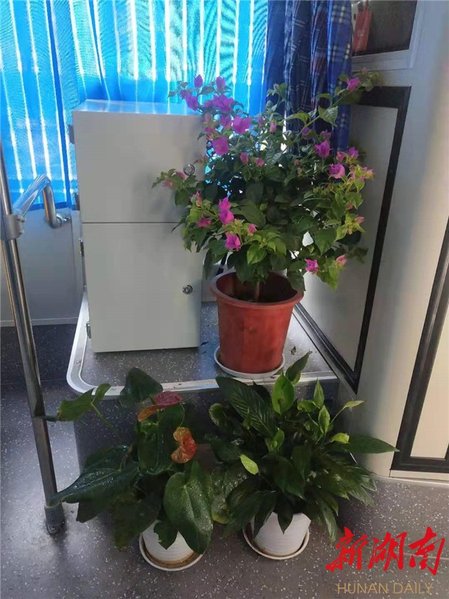 昨天下午五时许,热浪未褪,记者在长沙市政府东站登上湖南龙骧巴士70路公交车。一上车,花香迎面扑来。投币台上,一盆白掌开得正旺,往里瞧,驾驶座后方摆着白掌、红掌、三角梅,煞是好看,后门处摆放的“大家伙”是一株发财树,上面挂着几盏红色小灯笼,给人一种家的温馨。