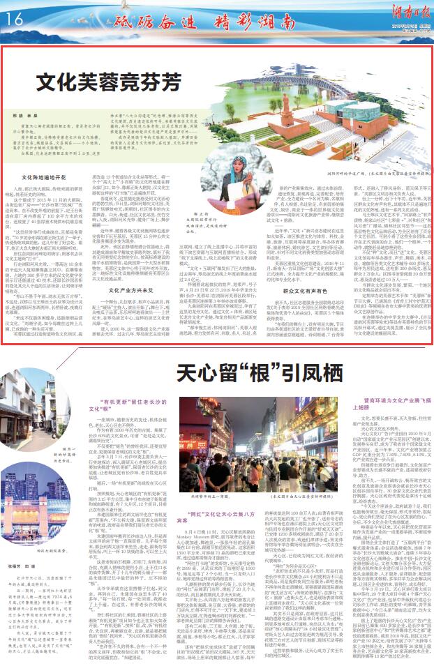 芙蓉区重视文化创意建设。2016年11月,新南天·古汉国际广场“文化创意大楼”正式挂牌,全力提升文化产业的规模化、集约化和专业化水平。