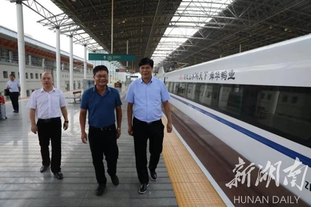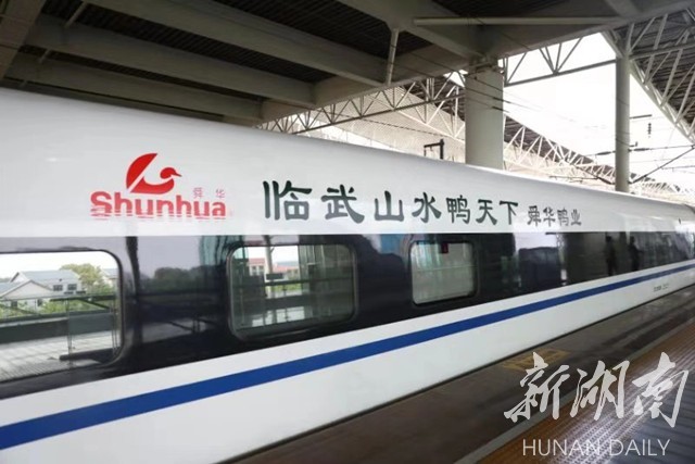 湖南日报·新湖南客户端8月23日讯(罗徽)8月22日中午12点26分,车身贴着“舜华临武鸭”的G1007次列车驶进郴州西站。这趟由湖北武汉始发,途经长沙、郴州、广州等10个站,最终抵达深圳的列车是张贴临武鸭广告后的首次发车。也意味着郴州农产品借助高铁平台,对接粤港澳大湾区市场迈出了坚实一步。