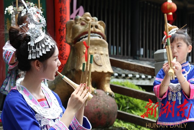 拍摄现场,侗族大歌、拦门酒、赛芦笙等等的侗族风俗、表演形式在两大剧组的镜头下展开。侗族姑娘、小伙们盛装出席,整个皇都村歌舞翩翩、银潮滚滚、服饰斑斓,一句句“哆耶”侗歌甜美嘹亮,一曲曲芦笙悠扬绵长,一场热烈隆重的拦门仪式,一碗浓郁香甜的拦门酒,每一帧画面无不把通道侗族这极具特色而又热情好客的特点体现得淋漓尽致。“皇都这个侗寨,人美歌甜风景好,酒香热情韵味足啊”,衡阳的刘先生在一旁观看剧组拍摄侗族大歌场景时情不自禁的说到。